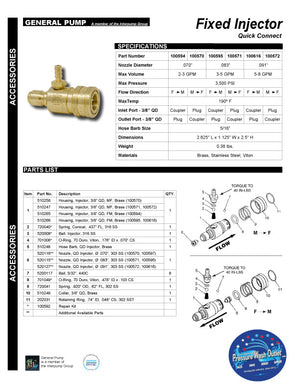 These acid injector kits by General Pump include: adjustable injector QC inlet & outlet 4000 PSI maximum 4 feet clear vinyl tubing strainer with check valve up to 20% draw rate Available in 3 sizes: 1.8mm = 2-3 GPM 2.1mm = 3-5 GPM 2.3mm = 5-8 GPM