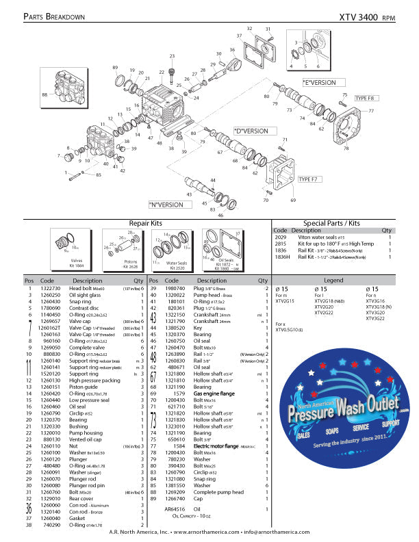 The XW30.25N Pump by AR features: Max GPM 7.92 Max L/Min 30 Max PSI 3600 MaxBar 250 Power EBHP 19 Bore Dia mm 22 Stroke mm 19.8 Crankshaft ID Stamp 1 Inlet 3/4" F Outlet 3/8" F Max Temp 140° F Oil Capacity (oz) 32 Weight 34 RPM 1450 Shaft Size 24mm Shaft Version N Shaft Type Solid Replacement Parts Check V...