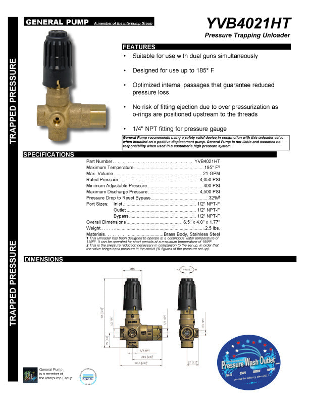 {"id":8460090802476,"title":"MULTI-GUN PRESSURE ACTUATED UNLOADER by GENERAL PUMP","handle":"6579-yvb4021b-balanced-relief-unloader-for-multiple-gun-systems","description":"\u003cp\u003eThe pressure actuated unloader is an excellent choice for those running multiple gun systems. This unloader from GP is available as:\u003c\/p\u003e\n\u003cp\u003eYVB4021HT - Max PSI 4050\u003c\/p\u003e\n\u003cp\u003eYVB5121B - Max PSI 5100\u003c\/p\u003e\n\u003cul\u003e\n\u003cli\u003e21 GPM max\u003c\/li\u003e\n\u003cli\u003e200 degrees F max\u003c\/li\u003e\n\u003cli\u003e1\/2\" FPT I\/O bypass\u003c\/li\u003e\n\u003cli\u003e1\/4\" fitting for pressure gauge\u003c\/li\u003e\n\u003c\/ul\u003e\n\u003cp\u003eSuitable for use with multiple guns at the same time. Dynamic seals made up of o-rings and teflon runner. No risk of fittings being ejected in case of overpressure because o-rings are position upstream to the threads.\u003c\/p\u003e\n\u003cp\u003eNot the right one for you? Take a look at our \u003cstrong\u003e\u003cspan style=\"color: #2b00ff;\"\u003e\u003ca style=\"color: #2b00ff;\" href=\"https:\/\/www.pressurewashoutlet.com\/collections\/unloaders\"\u003eUnloader Collection\u003c\/a\u003e\u003c\/span\u003e\u003c\/strong\u003e for more options.\u003c\/p\u003e\n\u003cp\u003e \u003c\/p\u003e\n\u003cp\u003e \u003c\/p\u003e","published_at":"2023-07-17T09:50:39-04:00","created_at":"2023-07-17T09:50:42-04:00","vendor":"General Pump","type":"Unloader","tags":["balanced relief unloader","georgia pressure wash store","multiple gun unloader","north american pressure wash outlet","North Georgia pressure wash supplies","parts for pressure washers","power wash equipment","pressure wash equipment","pressure wash parts delivered","pressure wash supply store","YVB4021HT"],"price":18900,"price_min":18900,"price_max":20586,"available":true,"price_varies":true,"compare_at_price":null,"compare_at_price_min":0,"compare_at_price_max":0,"compare_at_price_varies":false,"variants":[{"id":49857919713580,"title":"YVB4021HT (6579)","option1":"YVB4021HT (6579)","option2":null,"option3":null,"sku":"6579","requires_shipping":true,"taxable":true,"featured_image":{"id":52524741984556,"product_id":8460090802476,"position":1,"created_at":"2026-02-09T20:57:06-05:00","updated_at":"2026-02-09T20:57:08-05:00","alt":null,"width":288,"height":288,"src":"\/\/pressurewashpartsdelivered.com\/cdn\/shop\/files\/YVB4021HT_3f3a90c3-ca9a-41ab-9f23-f74e22479d01.jpg?v=1770688628","variant_ids":[49857919713580]},"available":true,"name":"MULTI-GUN PRESSURE ACTUATED UNLOADER by GENERAL PUMP - YVB4021HT (6579)","public_title":"YVB4021HT (6579)","options":["YVB4021HT (6579)"],"price":18900,"weight":1361,"compare_at_price":null,"inventory_management":"shopify","barcode":"","featured_media":{"alt":null,"id":43382819193132,"position":1,"preview_image":{"aspect_ratio":1.0,"height":288,"width":288,"src":"\/\/pressurewashpartsdelivered.com\/cdn\/shop\/files\/YVB4021HT_3f3a90c3-ca9a-41ab-9f23-f74e22479d01.jpg?v=1770688628"}},"requires_selling_plan":false,"selling_plan_allocations":[]},{"id":49857919746348,"title":"YVB5121B (6571)","option1":"YVB5121B (6571)","option2":null,"option3":null,"sku":"6571","requires_shipping":true,"taxable":true,"featured_image":{"id":52524742017324,"product_id":8460090802476,"position":2,"created_at":"2026-02-09T20:57:06-05:00","updated_at":"2026-02-09T20:57:09-05:00","alt":null,"width":288,"height":288,"src":"\/\/pressurewashpartsdelivered.com\/cdn\/shop\/files\/YVB5121B.jpg?v=1770688629","variant_ids":[49857919746348]},"available":true,"name":"MULTI-GUN PRESSURE ACTUATED UNLOADER by GENERAL PUMP - YVB5121B (6571)","public_title":"YVB5121B (6571)","options":["YVB5121B (6571)"],"price":20586,"weight":1361,"compare_at_price":null,"inventory_management":"shopify","barcode":"","featured_media":{"alt":null,"id":43382819225900,"position":2,"preview_image":{"aspect_ratio":1.0,"height":288,"width":288,"src":"\/\/pressurewashpartsdelivered.com\/cdn\/shop\/files\/YVB5121B.jpg?v=1770688629"}},"requires_selling_plan":false,"selling_plan_allocations":[]}],"images":["\/\/pressurewashpartsdelivered.com\/cdn\/shop\/files\/YVB4021HT_3f3a90c3-ca9a-41ab-9f23-f74e22479d01.jpg?v=1770688628","\/\/pressurewashpartsdelivered.com\/cdn\/shop\/files\/YVB5121B.jpg?v=1770688629","\/\/pressurewashpartsdelivered.com\/cdn\/shop\/files\/YVB4021HT_81f3846f-992f-4af6-bf57-ec635df72dbd.jpg?v=1770688628","\/\/pressurewashpartsdelivered.com\/cdn\/shop\/files\/YVB4021HTBALANCEDRELIEFUNLOADERFOR_MULTIPLEGUNSYSTEMS__6579_-shopcode_d33d5c49-1841-4689-b89e-c4906fd31d81.png?v=1770688628"],"featured_image":"\/\/pressurewashpartsdelivered.com\/cdn\/shop\/files\/YVB4021HT_3f3a90c3-ca9a-41ab-9f23-f74e22479d01.jpg?v=1770688628","options":["Model"],"media":[{"alt":null,"id":43382819193132,"position":1,"preview_image":{"aspect_ratio":1.0,"height":288,"width":288,"src":"\/\/pressurewashpartsdelivered.com\/cdn\/shop\/files\/YVB4021HT_3f3a90c3-ca9a-41ab-9f23-f74e22479d01.jpg?v=1770688628"},"aspect_ratio":1.0,"height":288,"media_type":"image","src":"\/\/pressurewashpartsdelivered.com\/cdn\/shop\/files\/YVB4021HT_3f3a90c3-ca9a-41ab-9f23-f74e22479d01.jpg?v=1770688628","width":288},{"alt":null,"id":43382819225900,"position":2,"preview_image":{"aspect_ratio":1.0,"height":288,"width":288,"src":"\/\/pressurewashpartsdelivered.com\/cdn\/shop\/files\/YVB5121B.jpg?v=1770688629"},"aspect_ratio":1.0,"height":288,"media_type":"image","src":"\/\/pressurewashpartsdelivered.com\/cdn\/shop\/files\/YVB5121B.jpg?v=1770688629","width":288},{"alt":"YVB4021HT BALANCED RELIEF UNLOADER FOR \"MULTIPLE GUN SYSTEMS\" ","id":43382819258668,"position":3,"preview_image":{"aspect_ratio":0.773,"height":792,"width":612,"src":"\/\/pressurewashpartsdelivered.com\/cdn\/shop\/files\/YVB4021HT_81f3846f-992f-4af6-bf57-ec635df72dbd.jpg?v=1770688628"},"aspect_ratio":0.773,"height":792,"media_type":"image","src":"\/\/pressurewashpartsdelivered.com\/cdn\/shop\/files\/YVB4021HT_81f3846f-992f-4af6-bf57-ec635df72dbd.jpg?v=17706886