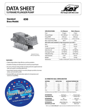 This CAT pump is rated: 3.0 GPM 1000 PSI 1330 RPM 16.5 mm 12 lb. Replacement Parts Pump Oil (3364) Cup Kit - 30023 Piston Kit - 30202 (3367) Seal Kit - 30305 (3368) Valve Kit - 30686 Pump Manual Pump Service Manual