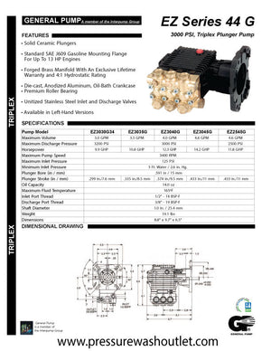 {"id":8460289835308,"title":"EZ3045G PUMP by GENERAL PUMP (5335)","handle":"ez3045g-pump-4-6gpm-3000psi-1-gas-flang","description":"\u003cp\u003eThis EZ3045G General Pump features:\u003c\/p\u003e\n\u003cul\u003e\n\u003cli\u003eSolid ceramic plungers\u003c\/li\u003e\n\u003cli\u003eStandard SAE J609 gasoline mounting flange for up to 13 hp engines\u003c\/li\u003e\n\u003cli\u003eForged brass manifold with an exclusive lifetime warranty and 4:1 hydrostatic rating\u003c\/li\u003e\n\u003cli\u003eDie-cast, anodized aluminum, oil-bath crankcase\u003c\/li\u003e\n\u003cli\u003ePremium roller bearing\u003c\/li\u003e\n\u003cli\u003eUnitized stainless steel inlet and discharge valves\u003c\/li\u003e\n\u003cli\u003eAvailable in L left-handed version\u003c\/li\u003e\n\u003c\/ul\u003e\n\u003cp\u003eThe EZ3045G is rated at:\u003c\/p\u003e\n\u003ctable border=\"0\" cellspacing=\"0\" cellpadding=\"0\" style=\"width: 437px;\"\u003e\n\u003ctbody\u003e\n\u003ctr\u003e\n\u003ctd style=\"width: 250px;\"\u003e\u003cb\u003e\u003cspan face=\"Arial,\" size=\"2\" style=\"font-size: small;\"\u003eMaximum Volume\u003c\/span\u003e\u003c\/b\u003e\u003c\/td\u003e\n\u003ctd style=\"width: 185px;\"\u003e\u003cspan face=\"Arial,\" size=\"2\" style=\"font-size: small;\"\u003e4.6 gpm\u003c\/span\u003e\u003c\/td\u003e\n\u003c\/tr\u003e\n\u003ctr\u003e\n\u003ctd style=\"width: 250px;\"\u003e\u003cb\u003e\u003cspan face=\"Arial,\" size=\"2\" style=\"font-size: small;\"\u003eMax. Discharge Pressure\u003c\/span\u003e\u003c\/b\u003e\u003c\/td\u003e\n\u003ctd style=\"width: 185px;\"\u003e\u003cspan face=\"Arial,\" size=\"2\" style=\"font-size: small;\"\u003e3000 psi\u003c\/span\u003e\u003c\/td\u003e\n\u003c\/tr\u003e\n\u003ctr\u003e\n\u003ctd style=\"width: 250px;\"\u003e\u003cb\u003e\u003cspan face=\"Arial,\" size=\"2\" style=\"font-size: small;\"\u003eMaximum Pump Speed\u003c\/span\u003e\u003c\/b\u003e\u003c\/td\u003e\n\u003ctd style=\"width: 185px;\"\u003e\u003cspan face=\"Arial,\" size=\"2\" style=\"font-size: small;\"\u003e3400 rpm\u003c\/span\u003e\u003c\/td\u003e\n\u003c\/tr\u003e\n\u003ctr\u003e\n\u003ctd style=\"width: 250px;\"\u003e\u003cb\u003e\u003cspan face=\"Arial,\" size=\"2\" style=\"font-size: small;\"\u003eMaximum Inlet Pressure\u003c\/span\u003e\u003c\/b\u003e\u003c\/td\u003e\n\u003ctd style=\"width: 185px;\"\u003e\u003cspan face=\"Arial,\" size=\"2\" style=\"font-size: small;\"\u003e125 psi\u003c\/span\u003e\u003c\/td\u003e\n\u003c\/tr\u003e\n\u003ctr\u003e\n\u003ctd style=\"width: 250px;\"\u003e\u003cb\u003e\u003cspan face=\"Arial,\" size=\"2\" style=\"font-size: small;\"\u003eMaximum Inlet Vacuum\u003c\/span\u003e\u003c\/b\u003e\u003c\/td\u003e\n\u003ctd style=\"width: 185px;\"\u003e\u003cspan face=\"Arial,\" size=\"2\" style=\"font-size: small;\"\u003e3 ft. water (2.6 in Hg)\u003c\/span\u003e\u003c\/td\u003e\n\u003c\/tr\u003e\n\u003ctr\u003e\n\u003ctd style=\"width: 250px;\"\u003e\u003cb\u003e\u003cspan face=\"Arial,\" size=\"2\" style=\"font-size: small;\"\u003eBore\u003c\/span\u003e\u003c\/b\u003e\u003c\/td\u003e\n\u003ctd style=\"width: 185px;\"\u003e\u003cspan face=\"Arial,\" size=\"2\" style=\"font-size: small;\"\u003e.591 in \/ 15 mm\u003c\/span\u003e\u003c\/td\u003e\n\u003c\/tr\u003e\n\u003ctr\u003e\n\u003ctd style=\"width: 250px;\"\u003e\u003cb\u003e\u003cspan face=\"Arial,\" size=\"2\" style=\"font-size: small;\"\u003eStroke\u003c\/span\u003e\u003c\/b\u003e\u003c\/td\u003e\n\u003ctd style=\"width: 185px;\"\u003e\u003cspan face=\"Arial,\" size=\"2\" style=\"font-size: small;\"\u003e.433 in \/ 11 mm\u003c\/span\u003e\u003c\/td\u003e\n\u003c\/tr\u003e\n\u003ctr\u003e\n\u003ctd style=\"width: 250px;\"\u003e\u003cb\u003e\u003cspan face=\"Arial,\" size=\"2\" style=\"font-size: small;\"\u003eCrankcase Oil Capacity\u003c\/span\u003e\u003c\/b\u003e\u003c\/td\u003e\n\u003ctd style=\"width: 185px;\"\u003e\u003cspan face=\"Arial,\" size=\"2\" style=\"font-size: small;\"\u003e14.0 oz\u003c\/span\u003e\u003c\/td\u003e\n\u003c\/tr\u003e\n\u003ctr\u003e\n\u003ctd style=\"width: 250px;\"\u003e\u003cb\u003e\u003cspan face=\"Arial,\" size=\"2\" style=\"font-size: small;\"\u003eMaximum Fluid Temperature\u003c\/span\u003e\u003c\/b\u003e\u003c\/td\u003e\n\u003ctd style=\"width: 185px;\"\u003e\u003cspan face=\"Arial,\" size=\"2\" style=\"font-size: small;\"\u003e165°F\u003c\/span\u003e\u003c\/td\u003e\n\u003c\/tr\u003e\n\u003ctr\u003e\n\u003ctd style=\"width: 250px;\"\u003e\u003cb\u003e\u003cspan face=\"Arial,\" size=\"2\" style=\"font-size: small;\"\u003eInlet Port Thread\u003c\/span\u003e\u003c\/b\u003e\u003c\/td\u003e\n\u003ctd style=\"width: 185px;\"\u003e\u003cspan face=\"Arial,\" size=\"2\" style=\"font-size: small;\"\u003e1\/2-14 BSPP-F\u003c\/span\u003e\u003c\/td\u003e\n\u003c\/tr\u003e\n\u003ctr\u003e\n\u003ctd style=\"width: 250px;\"\u003e\u003cb\u003e\u003cspan face=\"Arial,\" size=\"2\" style=\"font-size: small;\"\u003eDischarge Port Thread\u003c\/span\u003e\u003c\/b\u003e\u003c\/td\u003e\n\u003ctd style=\"width: 185px;\"\u003e\u003cspan face=\"Arial,\" size=\"2\" style=\"font-size: small;\"\u003e3\/8-19 BSPP-F\u003c\/span\u003e\u003c\/td\u003e\n\u003c\/tr\u003e\n\u003ctr\u003e\n\u003ctd style=\"width: 250px;\"\u003e\u003cb\u003e\u003cspan face=\"Arial,\" size=\"2\" style=\"font-size: small;\"\u003eHollow Shaft I.D.\u003c\/span\u003e\u003c\/b\u003e\u003c\/td\u003e\n\u003ctd style=\"width: 185px;\"\u003e\u003cspan face=\"Arial,\" size=\"2\" style=\"font-size: small;\"\u003e1.0 in \/ 25.4 mm\u003c\/span\u003e\u003c\/td\u003e\n\u003c\/tr\u003e\n\u003ctr\u003e\n\u003ctd style=\"width: 250px;\"\u003e\u003cb\u003e\u003cspan face=\"Arial,\" size=\"2\" style=\"font-size: small;\"\u003eWeight\u003c\/span\u003e\u003c\/b\u003e\u003c\/td\u003e\n\u003ctd style=\"width: 185px;\"\u003e\u003cspan face=\"Arial,\" size=\"2\" style=\"font-size: small;\"\u003e19.1 lbs\u003c\/span\u003e\u003c\/td\u003e\n\u003c\/tr\u003e\n\u003ctr\u003e\n\u003ctd style=\"width: 250px;\"\u003e\u003cb\u003e\u003cspan face=\"Arial,\" size=\"2\" style=\