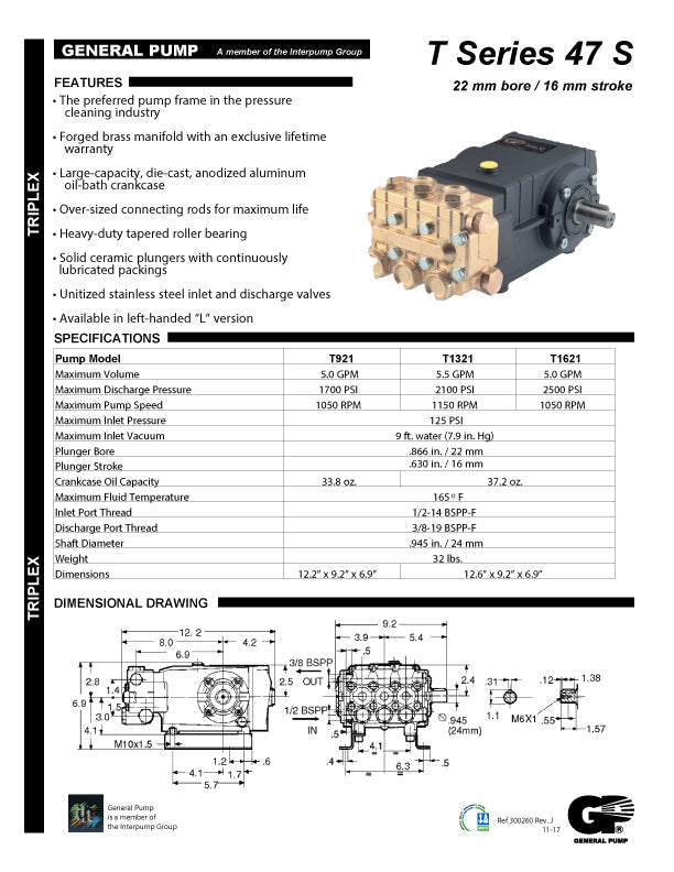 TS9281 - T Series 47 - Right Shaft 16 mm bore / 16 mm stroke • The preferred pump frame in the pressure cleaning industry • Forged brass manifold with an exclusive lifetime warranty • Large-capacity, die-cast, anodized aluminum oil-bath crankcase • Over-sized connecting rods for maximum life • Heavy-duty tapered roller bearing. • Unitize...