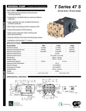 The TSF2021L pump by General Pump is rated at: 7.0-8.5 GPM 3600 PSI 1450/1750 RPM The TSF2021L pump by General Pump features: • Oversized roller bearings • Fully anodized crankcase • Innovative new seal design extends seal life • New plunger design improves thermal shock resistance • New valve cap improves hydrostatic performance