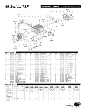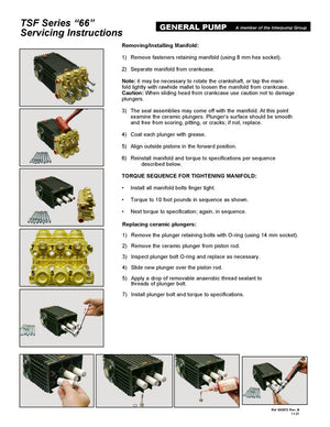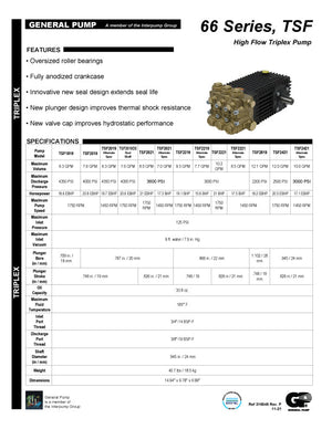 The TSF2019 pump by General Pump features Oversized roller bearings Fully anodized crankcase Innovative new seal design extends seal life New plunger design improves thermal shock resistance New valve cap improves hydrostatic performance Click Here for Product Spec Sheet