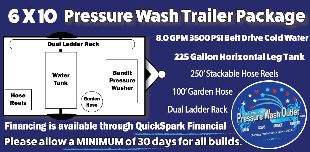 We are pleased to offer this 6 x 10 trailer package. This package includes... 4 GPM 3500 PSI BANDIT cold water BELT DRIVE pressure washer 6 x 10 heavy duty trailer dual ladder racks (street side) (2) Hosetract hose reels 250' stackable 225 gallon tank with straps Financing with Approve – North American Pressure Wash Outlet
