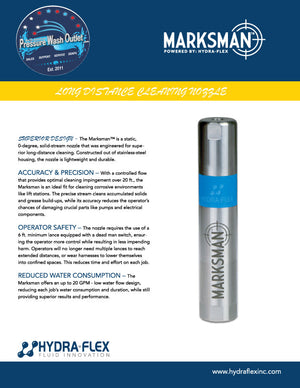 {"id":8459976048940,"title":"MARKSMAN LONG DISTANCE CLEANING NOZZLE by HYDRAFLEX","handle":"marksman-long-distance-cleaning-nozzle-by-hydraflex","description":"\u003cp\u003e\u003cstrong\u003eThe Marksman long distance shooter tip cleaning nozzle by Hydraflex features\u003c\/strong\u003e\u003c\/p\u003e\n\u003cp\u003e\u003cstrong\u003eSUPERIOR DESIGN \u003c\/strong\u003e\u003c\/p\u003e\n\u003cp\u003eThe Marksman™ is a static, 0-degree, solid-stream nozzle that was engineered for superior long-distance cleaning. Constructed out of stainless-steel housing, the nozzle is lightweight and durable.\u003c\/p\u003e\n\u003cp\u003e\u003cstrong\u003eACCURACY \u0026amp; PRECISION \u003c\/strong\u003e\u003c\/p\u003e\n\u003cp\u003eWith a controlled flow that provides optimal cleaning impingement over 20 ft., the Marksman is an ideal fit for cleaning corrosive environments like lift stations. The precise stream cleans accumulated solids and grease build-ups, while its accuracy reduces the operator’s chances of damaging crucial parts like pumps and electrical components.\u003c\/p\u003e\n\u003cp\u003e\u003cstrong\u003eOPERATOR SAFETY \u003c\/strong\u003e\u003c\/p\u003e\n\u003cp\u003eThe nozzle requires the use of a 6 ft. minimum lance equipped with a dead man switch, ensuring the operator more control while resulting in less impending harm. Operators will no longer need multiple lances to reach extended distances, or wear harnesses to lower themselves into confined spaces. This reduces time and effort on each job.\u003c\/p\u003e\n\u003cp\u003e\u003cstrong\u003eREDUCED WATER CONSUMPTION \u003c\/strong\u003e\u003c\/p\u003e\n\u003cp\u003eThe Marksman offers an up to 20 GPM - low water flow design, reducing each job’s water consumption and duration, while still providing superior results and performance\u003c\/p\u003e\n\u003cp\u003e\u003ciframe width=\"520\" height=\"315\" src=\"https:\/\/www.youtube.com\/embed\/1xbwOSB4_ZE\" title=\"YouTube video player\" frameborder=\"0\" allow=\"accelerometer; autoplay; clipboard-write; encrypted-media; gyroscope; picture-in-picture; web-share\" allowfullscreen=\"\"\u003e\u003c\/iframe\u003e\u003c\/p\u003e","published_at":"2023-07-17T09:16:42-04:00","created_at":"2023-07-17T09:16:49-04:00","vendor":"Hydraflex","type":"Hydro Excavation","tags":["atlanta pressure wash supplies","georgia power wash store","georgia pressure wash store","georgia pressure wash supplies","HYDRAFLEX","industrial pressure wash nozzle","Marksman long rang nozzle","north american pressure wash outlet","North Georgia pressure wash supplies","parts for pressure washers","power wash equipment","pressure wash equipment","pressure wash parts delivered","pressure wash shooter tip","pressure washer parts delivered","pressurewashpartsdelivered","shooter nozzles","shooter tip"],"price":2290,"price_min":2290,"price_max":93200,"available":true,"price_varies":true,"compare_at_price":null,"compare_at_price_min":0,"compare_at_price_max":0,"compare_at_price_varies":false,"variants":[{"id":45724438233388,"title":"#12","option1":"#12","option2":null,"option3":null,"sku":"1003150-120","requires_shipping":true,"taxable":true,"featured_image":{"id":51466958766380,"product_id":8459976048940,"position":1,"created_at":"2025-09-24T16:03:29-04:00","updated_at":"2025-09-24T16:03:29-04:00","alt":"Marksman pressure wash nozzles available at North American Pressure Wash Outlet","width":288,"height":288,"src":"\/\/pressurewashpartsdelivered.com\/cdn\/shop\/files\/marksman-hydraflex-NOZZLE_097bd787-b3de-46c4-9f45-161b2e81f947.jpg?v=1758744209","variant_ids":[45724438233388,45724438266156,45724438298924]},"available":true,"name":"MARKSMAN LONG DISTANCE CLEANING NOZZLE by HYDRAFLEX - #12","public_title":"#12","options":["#12"],"price":93200,"weight":907,"compare_at_price":null,"inventory_management":"shopify","barcode":null,"featured_media":{"alt":"Marksman pressure wash nozzles available at North American Pressure Wash Outlet","id":42417372725548,"position":1,"preview_image":{"aspect_ratio":1.0,"height":288,"width":288,"src":"\/\/pressurewashpartsdelivered.com\/cdn\/shop\/files\/marksman-hydraflex-NOZZLE_097bd787-b3de-46c4-9f45-161b2e81f947.jpg?v=1758744209"}},"requires_selling_plan":false,"selling_plan_allocations":[]},{"id":45724438266156,"title":"#15","option1":"#15","option2":null,"option3":null,"sku":"1003150-150","requires_shipping":true,"taxable":true,"featured_image":{"id":51466958766380,"product_id":8459976048940,"position":1,"created_at":"2025-09-24T16:03:29-04:00","updated_at":"2025-09-24T16:03:29-04:00","alt":"Marksman pressure wash nozzles available at North American Pressure Wash Outlet","width":288,"height":288,"src":"\/\/pressurewashpartsdelivered.com\/cdn\/shop\/files\/marksman-hydraflex-NOZZLE_097bd787-b3de-46c4-9f45-161b2e81f947.jpg?v=1758744209","variant_ids":[45724438233388,45724438266156,45724438298924]},"available":true,"name":"MARKSMAN LONG DISTANCE CLEANING NOZZLE by HYDRAFLEX - #15","public_title":"#15","options":["#15"],"price":93200,"weight":907,"compare_at_price":null,"inventory_management":"shopify","barcode":null,"featured_media":{"alt":"Marksman pressure wash nozzles available at North American Pressure Wash Outlet","id":42417372725548,"position":1,"preview_image":{"aspect_ratio":1.0,"height":288,"width":288,"src":"\/\/pressurewashpartsdelivered.com\/cdn\/shop\/files\/marksman-hydraflex-NOZZLE_097bd787-b3de-46c4-9f45-161b2e81f947.jpg?v=1758744209"}},"requires_selling_plan":false,"selling_plan_allocations":[]},{"id":45724438298924,"title":"#20","option1":"#20","option2":null,"option3":null,"sku":"1003150-200","requires_shipping":true,"taxable":true,"featured_image":{"id":51466958766380,"product_id":8459976048940,"position":1,"created_at":"2025-09-24T16:03:29-04:00","updated_at":"2025-09-24T16:03:29-04:00","alt":"Marksman pressure wash nozzles available at North American Pressure Wash Outlet","width":288,"height":288,"src":"\/\/pressurewashpartsdelivered.com\/cdn\/shop\/files\/marksman-hydraflex-N