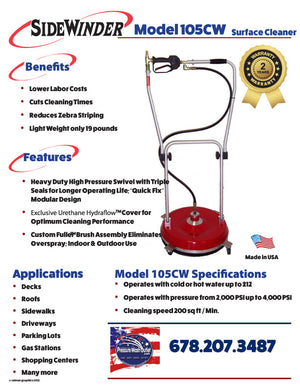 {"id":8460120817964,"title":"SIDEWINDER 20\" SURFACE CLEANER - MODEL 105CW - (6701)","handle":"sidewinder-surface-cleaner-model-105c-w-wheels","description":"\u003cp\u003eWith its patented foldable handle the Hydramotion Sidewinder Model 105 20 inch Flat Surface Cleaner quickly folds for easy storage in your shop or work vehicle. The Hydramotion Sidewinder Model 105 20 inch Flat Surface Cleaner is engineered and manufactured using high quality materials. This quality concrete cleaner 105 incorporates several new features, including.\u003c\/p\u003e\n\u003cp\u003e\u003cstrong\u003eFeatures:\u003c\/strong\u003e\u003c\/p\u003e\n\u003cli\u003eImproved Cleaning Effect with the HydraFlow TM Cover - Fluted design creates a focused spray pattern at the external radius of the spray bar arc.\u003c\/li\u003e\n\u003cli\u003eLonger Life with an Upgraded SuperSwivel TM - Increased rear shaft hardness and LP seals throughout extending swivel life and reducing down time for repair and maintenance. The Hydramotion Sidewinder Model 105 20 inch Flat Surface Cleaner is completely field reparable.\u003c\/li\u003e\n\u003cli\u003eInterchangeable Handles - Contractors and equipment rental operators can choose foldable and\/or rigid handles, as needed.\u003c\/li\u003e\n\u003cli\u003eThe Hydramotion Sidewinder Model 105 20 inch Flat Surface Cleaner features a heavy duty high pressure swivel with triple seals for longer operating life; “Quick Fix” modular design.\u003c\/li\u003e\n\u003cli\u003eThis concrete cleaner also has a custom Fuller Brush Assembly to eliminate overspray.\u003c\/li\u003e\n\u003cli\u003eThe Hydramotion Sidewinder Model 105 20 inch Flat Surface Cleaner features a Two Year Warranty - Still the industry’s best and longest! \u003c\/li\u003e\n\u003cp\u003e\u003cb\u003eMinimum requirements\u003c\/b\u003e\u003cspan\u003e- Your pressure washer must generate at least 2000 PSI \u0026amp; 3 GPM to use this surface cleaner. Please keep in mind that the minimum requirements can mean lower performance of your surface cleaner. If your pressure washer is at minimum end of what is required to use this surface cleaner, we recommend either using a smaller surface cleaner or upgrading your pressure washer to a more powerful model to get full performance.\u003c\/span\u003e\u003c\/p\u003e\n\u003cli\u003eLower Labor Costs\u003c\/li\u003e\n\u003cli\u003eCuts Cleaning Times\u003c\/li\u003e\n\u003cli\u003eReduces Zebra Striping\u003c\/li\u003e\n\u003cli\u003eLight Weight only 19 pounds\u003c\/li\u003e\n\u003cli\u003eOperates with cold or hot water up to 212 F\u003c\/li\u003e\n\u003cli\u003eOperates with pressure from 2,000 PSI up to 4,000 PSI\u003c\/li\u003e\n\u003cli\u003eCleaning speed 200 sq ft \/ Min. \u003c\/li\u003e\n\u003cp\u003e\u003cspan\u003eThe Hydramotion Sidewinder Model 105 20 inch Flat Surface Cleaner uses Military Specified Urethane, airframe grade aluminum and a Fuller Brush™ skirt assembly. All \u003c\/span\u003e\u003cspan\u003esub-assemblies\u003c\/span\u003e\u003cspan\u003e are interchangeable from model to model for ease of upgrading, maintenance and repair.\u003c\/span\u003e\u003c\/p\u003e\n\u003cli\u003eType of adapter: 3\/8\" male quick connect plug at the end of the gun where the pressure washer hose attaches.\u003c\/li\u003e","published_at":"2023-07-17T09:59:37-04:00","created_at":"2023-07-17T09:59:42-04:00","vendor":"Sidewinder","type":"Surface Cleaners","tags":["20\" surface cleaner","gainesville georgia","Hydramotion","power wash equipment","pressure wash equipment","Side Winder Surface Cleaner","surface cleaners"],"price":104664,"price_min":104664,"price_max":104664,"available":true,"price_varies":false,"compare_at_price":null,"compare_at_price_min":0,"compare_at_price_max":0,"compare_at_price_varies":false,"variants":[{"id":45724850585900,"title":"Default Title","option1":"Default Title","option2":null,"option3":null,"sku":"6701","requires_shipping":true,"taxable":true,"featured_image":null,"available":true,"name":"SIDEWINDER 20\" SURFACE CLEANER - MODEL 105CW - (6701)","public_title":null,"options":["Default Title"],"price":104664,"weight":9072,"compare_at_price":null,"inventory_management":null,"barcode":null,"requires_selling_plan":false,"selling_plan_allocations":[]}],"images":["\/\/pressurewashpartsdelivered.com\/cdn\/shop\/files\/collapsable_red_1b3cd8dd-8937-4e2e-8a8c-a665ecc25809.jpg?v=1758747369","\/\/pressurewashpartsdelivered.com\/cdn\/shop\/files\/M105CW_10_28_15_a44f591c-865a-4395-a176-efd19e65e2c3.jpg?v=1758747369","\/\/pressurewashpartsdelivered.com\/cdn\/shop\/files\/logo-4s1_08d5bbf7-aae5-4c5e-bf47-6b4971b57348.png?v=1758747369","\/\/pressurewashpartsdelivered.com\/cdn\/shop\/files\/SIDEWINDER-105C_ffd590b8-5490-4584-9266-49df43768d57.jpg?v=1758747369","\/\/pressurewashpartsdelivered.com\/cdn\/shop\/files\/6701_SIDEWINDER20_SURFACECLEANER-MODEL105CW-shopcode_612fa956-79cc-42ca-942d-f7fbc5a7269f.png?v=1758747369"],"featured_image":"\/\/pressurewashpartsdelivered.com\/cdn\/shop\/files\/collapsable_red_1b3cd8dd-8937-4e2e-8a8c-a665ecc25809.jpg?v=1758747369","options":["Title"],"media":[{"alt":null,"id":42417580474668,"position":1,"preview_image":{"aspect_ratio":1.333,"height":300,"width":400,"src":"\/\/pressurewashpartsdelivered.com\/cdn\/shop\/files\/collapsable_red_1b3cd8dd-8937-4e2e-8a8c-a665ecc25809.jpg?v=1758747369"},"aspect_ratio":1.333,"height":300,"media_type":"image","src":"\/\/pressurewashpartsdelivered.com\/cdn\/shop\/files\/collapsable_red_1b3cd8dd-8937-4e2e-8a8c-a665ecc25809.jpg?v=1758747369","width":400},{"alt":null,"id":42417580507436,"position":2,"preview_image":{"aspect_ratio":0.773,"height":792,"width":612,"src":"\/\/pressurewashpartsdelivered.com\/cdn\/shop\/files\/M105CW_10_28_15_a44f591c-865a-4395-a176-efd19e65e2c3.jpg?v=1758747369"},"aspect_ratio":0.773,"height":792,"media_type":"image","src":"\/\/pressurewashpartsdelivered.com\/cdn\/shop\/files\/M105CW_10_28_15_a44f591c-865a-4395-a176-efd19e65e2c3.jpg?v=1758747369","width":612},{"alt":null,"id":