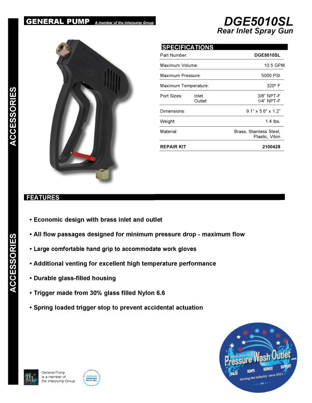 The PA YG5000 pressure wash trigger gun is rated: 12 GPM (NEW!! Increased GPM) Easy pull trigger Maximum Fluid Temperature 320 F Inlet Port Thread 3/8" NPT-F Discharge Port Thread 1/4" NPT-F Improved trigger design for easier pull at high pressure. Larger more comfortable hand grip space to accommodate gloves. Repair Kit is Available Here