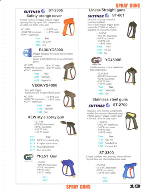 Comfort technology designed the ST-2305 easy-pull trigger and comfortable grip provide ease when working long hours. If you have extreme abuse applications, the ST-2305 is up for the challenge with its handle constructed of impact-resistant plastic. Suttner exclusive “easy-pull trigger” and comfort grip. 12 GPM 5000 PSI Easy opening and h...
