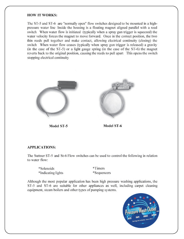 {"id":8460525502764,"title":"ST-5 FLOW SWITCH by SUTTNER VERTICAL MOUNT (1565)","handle":"suttner-st-5-flow-switch-vertical-mount","description":"\u003cp\u003eThe Suttner ST-5 flow switch is water activated to control the on and off of the burner. Suitable for pressure washers and carpet cleaning. \u003c\/p\u003e\n\u003cp\u003e\u003cspan style=\"text-decoration: underline;\"\u003e\u003cstrong\u003eRated at\u003c\/strong\u003e\u003c\/span\u003e:\u003c\/p\u003e\n\u003cul\u003e\n\u003cli\u003e8 GPM\u003c\/li\u003e\n\u003cli\u003e47\" long cord\u003c\/li\u003e\n\u003cli\u003e2 wire reed switch\u003c\/li\u003e\n\u003cli\u003e75 PSI minimum\u003c\/li\u003e\n\u003cli\u003e1.0 GPM minimum\u003c\/li\u003e\n\u003cli\u003e176 degrees F max\u003c\/li\u003e\n\u003c\/ul\u003e\n\u003cp\u003eRepair Kit is available.\u003c\/p\u003e","published_at":"2023-07-17T11:34:31-04:00","created_at":"2023-07-17T11:34:38-04:00","vendor":"Suttner","type":"Switches","tags":["flow switch","georgia pressure wash store","georgia pressure wash supplies","industrial pressure washer","north american pressure wash outlet","North Georgia pressure wash supplies","power wash equipment","pressure wash equipment","pressure wash parts delivered","pressure wash supply","pressure wash supply near me","pressure wash supply store","pressure washer flow switch","ST-5","Suttner"],"price":5050,"price_min":5050,"price_max":5050,"available":true,"price_varies":false,"compare_at_price":null,"compare_at_price_min":0,"compare_at_price_max":0,"compare_at_price_varies":false,"variants":[{"id":45726076436780,"title":"Default Title","option1":"Default Title","option2":null,"option3":null,"sku":"1565","requires_shipping":true,"taxable":true,"featured_image":null,"available":true,"name":"ST-5 FLOW SWITCH by SUTTNER VERTICAL MOUNT (1565)","public_title":null,"options":["Default Title"],"price":5050,"weight":454,"compare_at_price":null,"inventory_management":"shopify","barcode":null,"requires_selling_plan":false,"selling_plan_allocations":[]}],"images":["\/\/pressurewashpartsdelivered.com\/cdn\/shop\/files\/0039360_0_fb2c0506-67b6-4718-8917-bb18e1cefb5b.jpg?v=1758754901","\/\/pressurewashpartsdelivered.com\/cdn\/shop\/files\/st5-tech-sheet_005d596b-3d89-4d5b-81c6-ac3428a244c2.jpg?v=1758754901","\/\/pressurewashpartsdelivered.com\/cdn\/shop\/files\/ST5-_-ST6-manual_253ec412-4909-406e-b06b-e04310cc9c5e.jpg?v=1758754901","\/\/pressurewashpartsdelivered.com\/cdn\/shop\/files\/Suttner-logo_728e31d4-7da3-40ac-b1e1-f7cc18bee4d9.jpg?v=1758754901","\/\/pressurewashpartsdelivered.com\/cdn\/shop\/files\/ST-5FLOWSWITCHbySUTTNERVERTICALMOUNT_1565_-shopcode_ac155ce8-34ac-4baa-a573-72158c96832a.png?v=1758754901","\/\/pressurewashpartsdelivered.com\/cdn\/shop\/files\/thank-you_b5592924-72f5-4b5c-92f7-0cd35adb824d.jpg?v=1758754901"],"featured_image":"\/\/pressurewashpartsdelivered.com\/cdn\/shop\/files\/0039360_0_fb2c0506-67b6-4718-8917-bb18e1cefb5b.jpg?v=1758754901","options":["Title"],"media":[{"alt":"ST-5 FLOW SWITCH by SUTTNER VERTICAL MOUNT ","id":42417972412716,"position":1,"preview_image":{"aspect_ratio":1.0,"height":500,"width":500,"src":"\/\/pressurewashpartsdelivered.com\/cdn\/shop\/files\/0039360_0_fb2c0506-67b6-4718-8917-bb18e1cefb5b.jpg?v=1758754901"},"aspect_ratio":1.0,"height":500,"media_type":"image","src":"\/\/pressurewashpartsdelivered.com\/cdn\/shop\/files\/0039360_0_fb2c0506-67b6-4718-8917-bb18e1cefb5b.jpg?v=1758754901","width":500},{"alt":"ST-5 FLOW SWITCH by SUTTNER VERTICAL MOUNT ","id":42417972445484,"position":2,"preview_image":{"aspect_ratio":0.773,"height":792,"width":612,"src":"\/\/pressurewashpartsdelivered.com\/cdn\/shop\/files\/st5-tech-sheet_005d596b-3d89-4d5b-81c6-ac3428a244c2.jpg?v=1758754901"},"aspect_ratio":0.773,"height":792,"media_type":"image","src":"\/\/pressurewashpartsdelivered.com\/cdn\/shop\/files\/st5-tech-sheet_005d596b-3d89-4d5b-81c6-ac3428a244c2.jpg?v=1758754901","width":612},{"alt":"ST-5 FLOW SWITCH by SUTTNER VERTICAL MOUNT ","id":42417972478252,"position":3,"preview_image":{"aspect_ratio":0.773,"height":792,"width":612,"src":"\/\/pressurewashpartsdelivered.com\/cdn\/shop\/files\/ST5-_-ST6-manual_253ec412-4909-406e-b06b-e04310cc9c5e.jpg?v=1758754901"},"aspect_ratio":0.773,"height":792,"media_type":"image","src":"\/\/pressurewashpartsdelivered.com\/cdn\/shop\/files\/ST5-_-ST6-manual_253ec412-4909-406e-b06b-e04310cc9c5e.jpg?v=1758754901","width":612},{"alt":"Suttner products available at North American Pressure Wash Outlet.","id":42417972511020,"position":4,"preview_image":{"aspect_ratio":1.357,"height":258,"width":350,"src":"\/\/pressurewashpartsdelivered.com\/cdn\/shop\/files\/Suttner-logo_728e31d4-7da3-40ac-b1e1-f7cc18bee4d9.jpg?v=1758754901"},"aspect_ratio":1.357,"height":258,"media_type":"image","src":"\/\/pressurewashpartsdelivered.com\/cdn\/shop\/files\/Suttner-logo_728e31d4-7da3-40ac-b1e1-f7cc18bee4d9.jpg?v=1758754901","width":350},{"alt":null,"id":42417972543788,"position":5,"preview_image":{"aspect_ratio":0.65,"height":429,"width":279,"src":"\/\/pressurewashpartsdelivered.com\/cdn\/shop\/files\/ST-5FLOWSWITCHbySUTTNERVERTICALMOUNT_1565_-shopcode_ac155ce8-34ac-4baa-a573-72158c96832a.png?v=1758754901"},"aspect_ratio":0.65,"height":429,"media_type":"image","src":"\/\/pressurewashpartsdelivered.com\/cdn\/shop\/files\/ST-5FLOWSWITCHbySUTTNERVERTICALMOUNT_1565_-shopcode_ac155ce8-34ac-4baa-a573-72158c96832a.png?v=1758754901","width":279},{"alt":null,"id":42417972576556,"position":6,"preview_image":{"aspect_ratio":1.0,"height":288,"width":288,"src":"\/\/pressurewashpartsdelivered.com\/cdn\/shop\/files\/thank-you_b5592924-72f5-4b5c-92f7-0cd35adb824d.jpg?v=1758754901"},"aspect_ratio":1.0,"height":288,"media_type":"image","src":"\/\/pressurewashpartsdelivered.com\/cdn\/shop\/files\/thank-you_b5592924-72f5-4b5c-92f7-0cd35adb824d.jpg?v=1758754901","width":288}],"requires_selling_plan":false,"selling_plan_groups":[],"content":"\u003cp\u003eThe Suttner ST-5 flow switch is water activated to control the on and off of the burne
